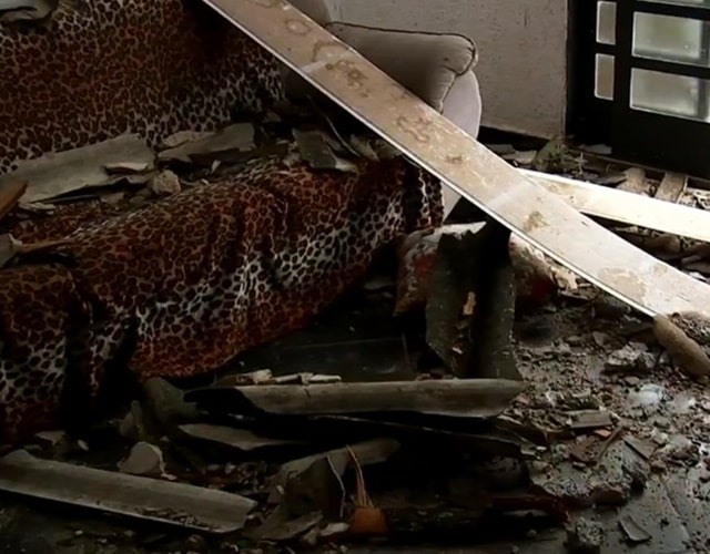 Na casa do vizinho, os estragos foram no quarto e telhado da cozinha.