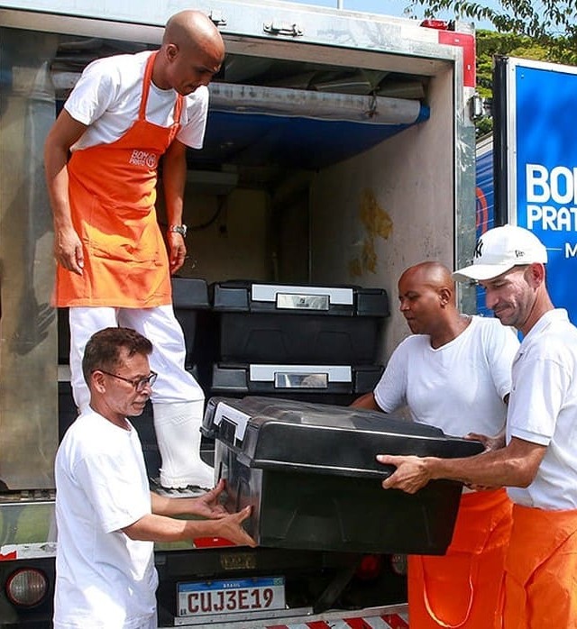 As refeições são todas preparadas em restaurantes fixos e o transporte dos alimentos é feito em caixas hotbox para garantir a segurança sanitária e a temperatura das refeições.