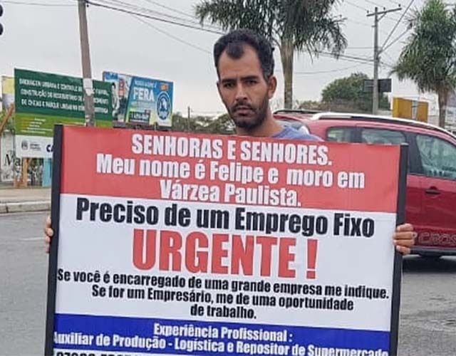 “Preciso de um emprego fixo. URGENTE!”. Essa é uma das frases escritas em cartaz que o morador de Várzea Paulista, Felipe Gustavo Passarinho de Souza, estava segurando na manhã desta terça-feira (20) na movimenta Avenida Fernão Dias Paes Leme.