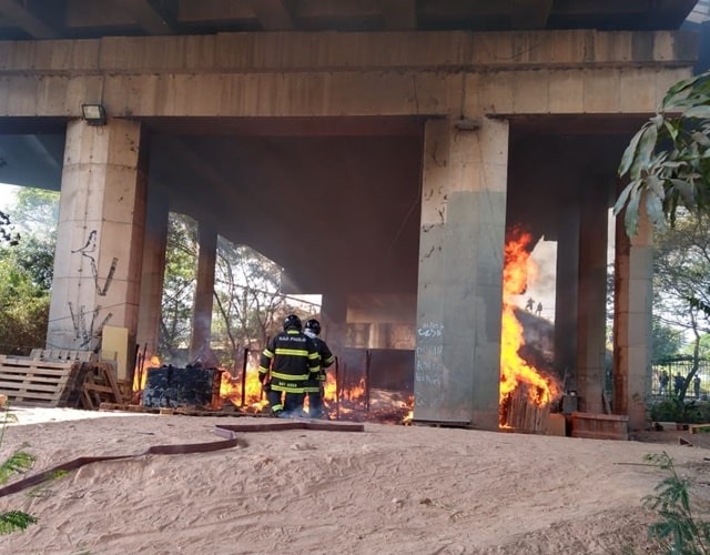 Ainda de acordo com o Corpo de Bombeiros, o fogo levou cerca de uma hora para ser controlado devido à quantidade de entulhos embaixo do viaduto, mas os barracos ficaram completamente destruídos.