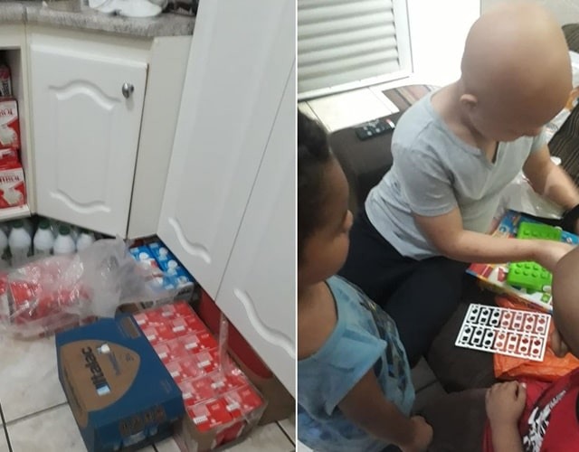 A youtuber mirim, Larissa Moraes, que tem alopecia, fez uma visita e entregou uma grande doação de leite para a família de Enzo. “Nem cabe no armário”, comemora Rosana.