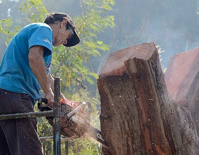 O artista plástico conta que a produção vai estrear a motosserra que ele comprou (máquina credenciada no Ministério de Meio Ambiente).