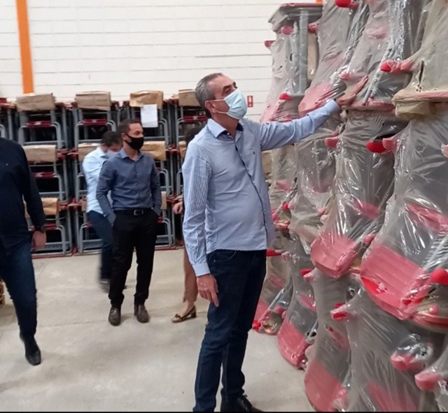 Na tarde de segunda-feira (10), o prefeito de Várzea Paulista, Rodolfo Braga, visitou o almoxarifado principal da Prefeitura para verificar a chegada de 2.170 itens para a Unidade Gestora de Educação. Entre os itens, estão conjuntos de cadeiras e carteiras para sala de aula, conjuntos de mesas e bancos para refeitório, conjuntos de mesa e cadeira para professor, mesa acessível PCD para alunos, cadeiras fixas e giratórias.