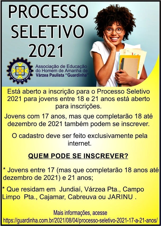 O Processo Seletivo 2021 para jovens entre 18 e 21 anos estão com inscrições abertas para jovens com 17 anos, mas que completarão 18 até dezembro de 2021 também podem se inscrever. O cadastro deve ser feito exclusivamente pela internet.