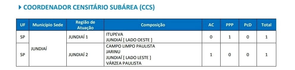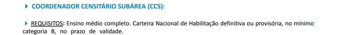 O Edital é para seleção de Coordenador Censitário de Subárea (regional) e Agente Censitário Operacional (capitais):