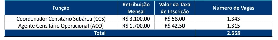 Primeiramente, são duas vagas de Coordenadores Censitários de Subárea. Ainda de acordo com a corporação, virão outros processos seletivos para vagas, como de Agente Censitário Municipal, Agente Censitário Supervisor, e Recenseador, na sequência do cronograma de contratação.