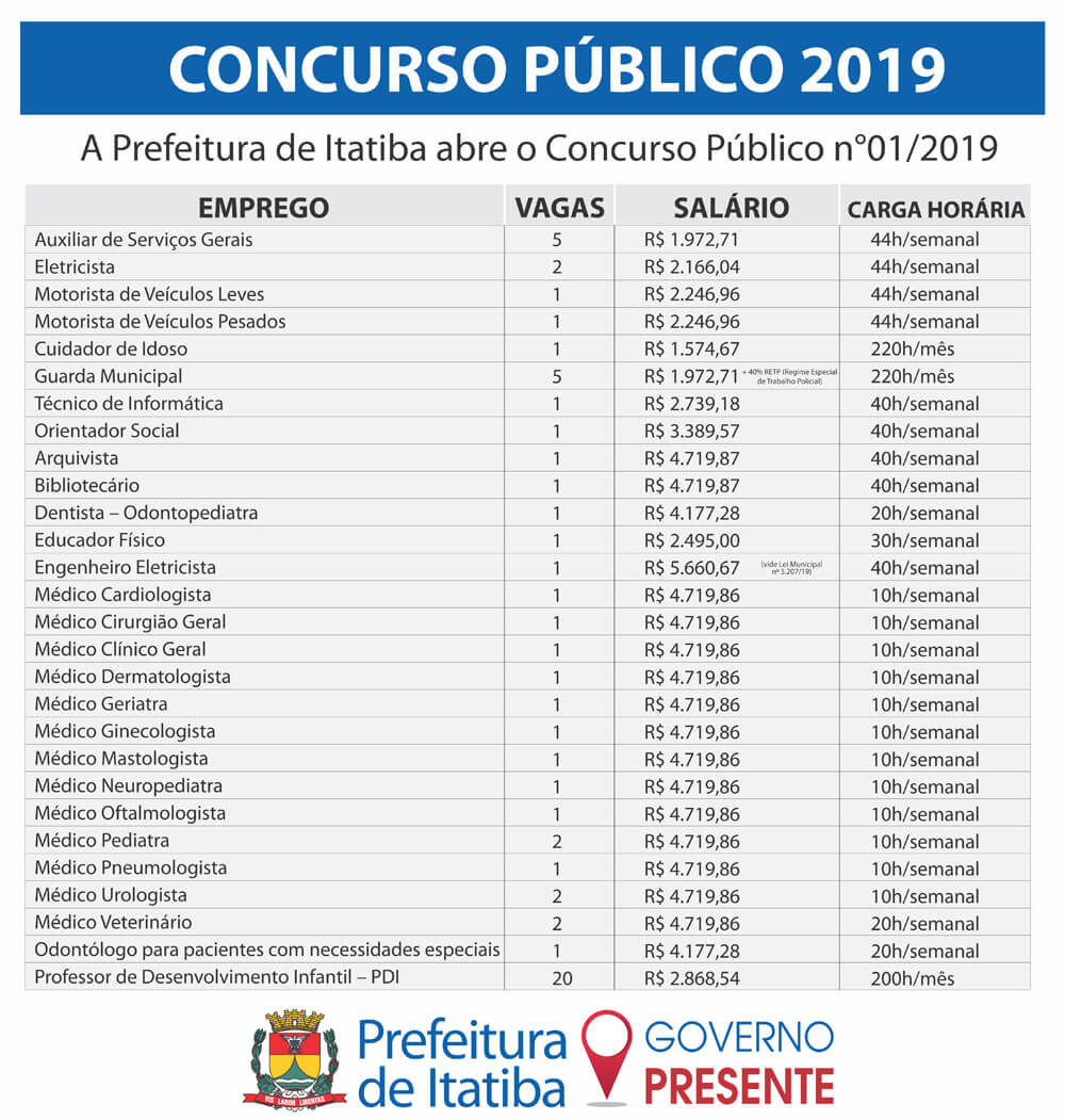 A Prefeitura de Itatiba está com inscrições abertas para Concurso Público até dia 7 de novembro. Os salários vão de R$ 1.574,67 até R$ 5.660,67, e entre os benefícios oferecidos está o cartão-alimentação no valor de R$ 595,00.