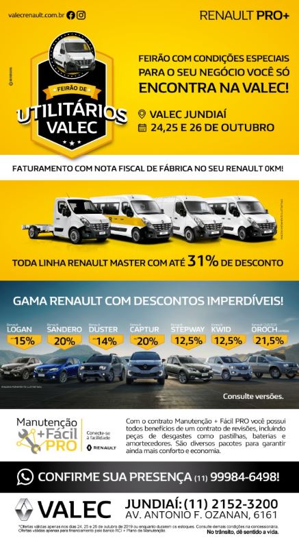 Nesta quinta-feira (24), sexta (25) e sábado (26) a Renault Valec, em Jundiaí, promove o “Feirão de Utilitários” com descontos que chegam a R$ 20 mil.
