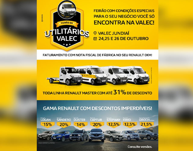 Nesta quinta-feira (24), sexta (25) e sábado (26) a Renault Valec, em Jundiaí, promove o “Feirão de Utilitários” com descontos que chegam a R$ 20 mil.