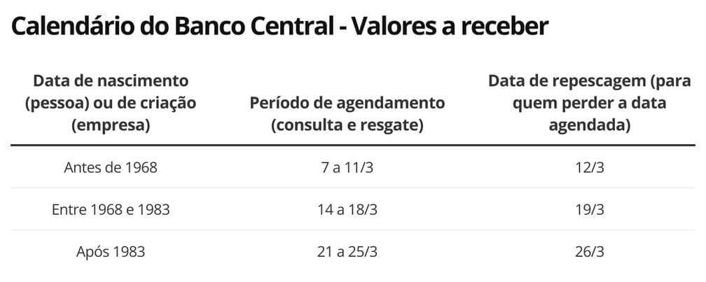 Entre os dias 7 e 14 de março, as consultas e pedidos de resgate serão liberados apenas para as pessoas nascidas antes de 1968 e para as empresas criadas antes deste mesmo ano. Já para os demais, os recursos serão liberados nas próximas semanas.