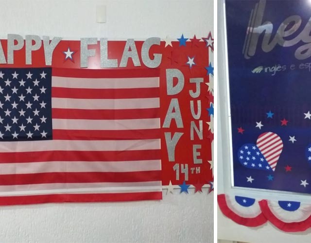 Neste mês, o espaço está todo decorado com bandeiras dos Estados Unidos, em referência ao “Flag Day”, que é o dia em que os americanos celebram a bandeira do próprio país. “É um dia muito especial para ees, que são um povo muito patriota”, explica a professora de inglês, Shirley Boone.