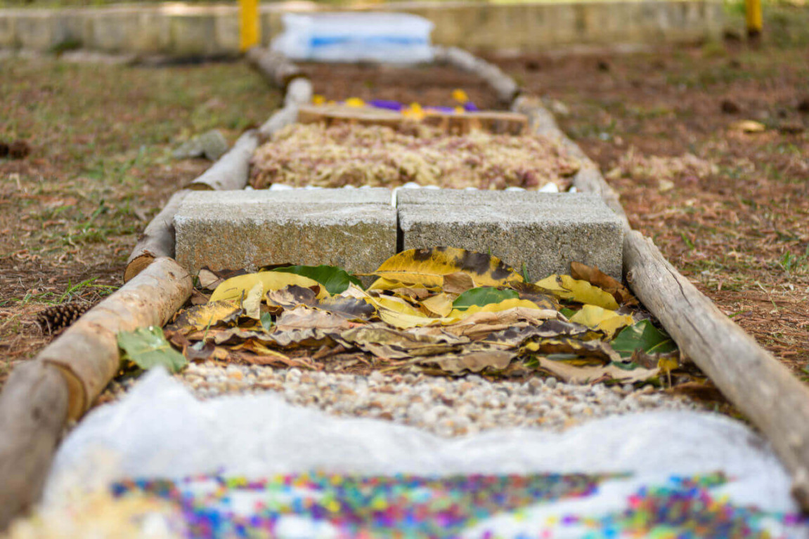 Os elementos incluídos no caminho foram recolhidos na própria escola, separados e classificados pelas próprias crianças. Antes de andar pela trilha, as crianças higienizaram os pés com álcool em gel.