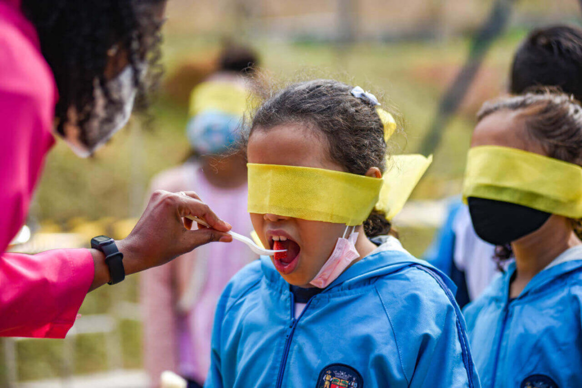 Após sair da trilha, a professora vendou os olhos das crianças para uma nova atividade. Cada aluno foi estimulado a descobrir qual fruta estava comendo, mas pelo olfato ou paladar.