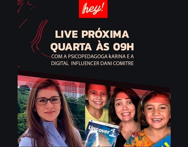 Com o objetivo de ajudar a esclarecer e orientar os pais sobre o assunto a Escola de Idiomas Hey convidou a psicopedagoga Karina e a digital influencer Dani Comitre para fazer uma Live pelo Instagram da escola @heyschool, nesta quarta-feira, às 9h.