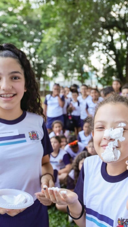 O encontro aconteceu na Emeb do Anhangabaú e, além de muita brincadeira e um farto piquenique comunitário, contou com uma dinâmica inspirada no clássico televisivo “Torta na Cara”, com perguntas em Português e respostas em Inglês. Ao som da plateia de colegas, cada disputa era seguida pelo grito uníssono: “Vai levar tortada!”.