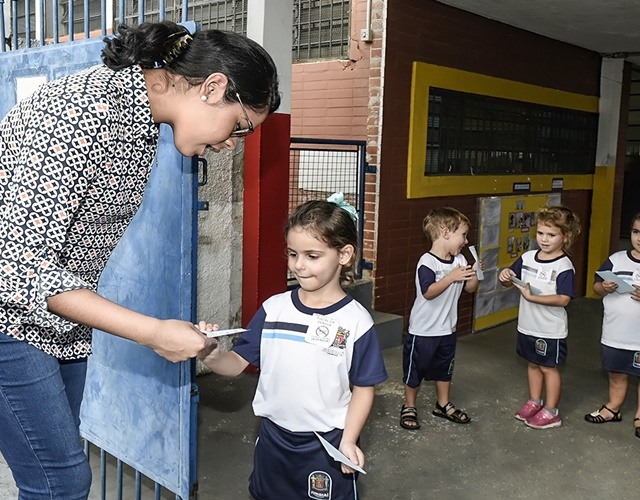 Eles vistoriaram ambientes simulando quintais de casas e distribuíram panfletos de orientação aos pais. O tema vem sendo trabalhado em conjunto entre as Unidades de Gestão de Educação (UGE) e de Promoção da Saúde (UGPS), anualmente, com o objetivo de eliminar criadouros da dengue com a família.