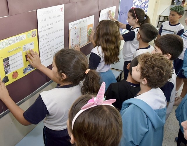 Já as turmas do 4º ano fizeram pesquisas e elaboraram cartazes sobre o tema. Com o assunto na ponta da Língua, Lara Niero Santos, de 8 anos, sabe dos riscos, das formas de contágio e os cuidados que devem ser seguidos.