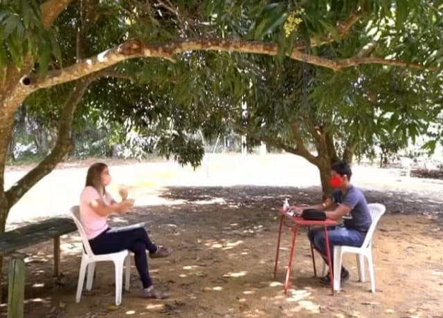 As aulas acontecem debaixo de um pé de manga, com uma distância segura entre aluno e professor.