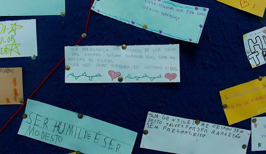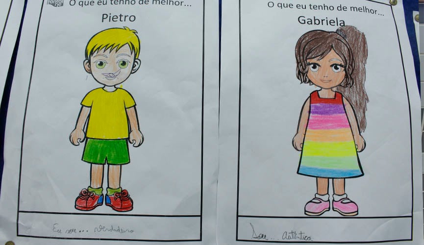 Pelos murais, também figuram frases sobre o que é ser gentil, solidário e humilde. Os alunos também pintaram desenhos como se fossem eles mesmos e escreveram, logo abaixo, tudo aquilo que eles têm de melhor, como forma de reconhecerem as próprias qualidades. “Sou verdadeiro”, diz desenho do aluno Pietro. Já a aluna Gabriela se considera “autêntica”, como escreveu em seu desenho.