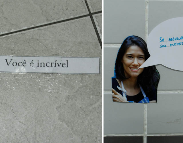 Além disso, a escola também promoveu um trabalho mútuo entre alunos do fundamental e médio. Os pequenos recortaram rostos de pessoas que encontraram em revistas e os maiores escreveram frases de incentivo em balões, como se tivessem sido ditas por essas pessoas. Todos os rostos e frases foram colados pelas paredes da escola, para incentivar ainda mais os que passam por ali.