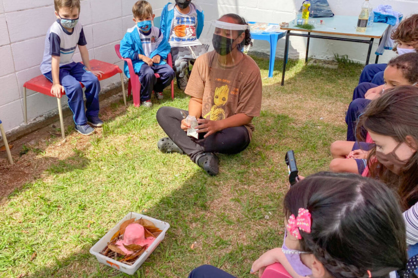 Além de ser realizada em ambiente externo, a atividade teve o contato com a natureza, quando as crianças foram para o parque para pegar folhas e galhos para fazer a vegetação ao redor do vulcão.