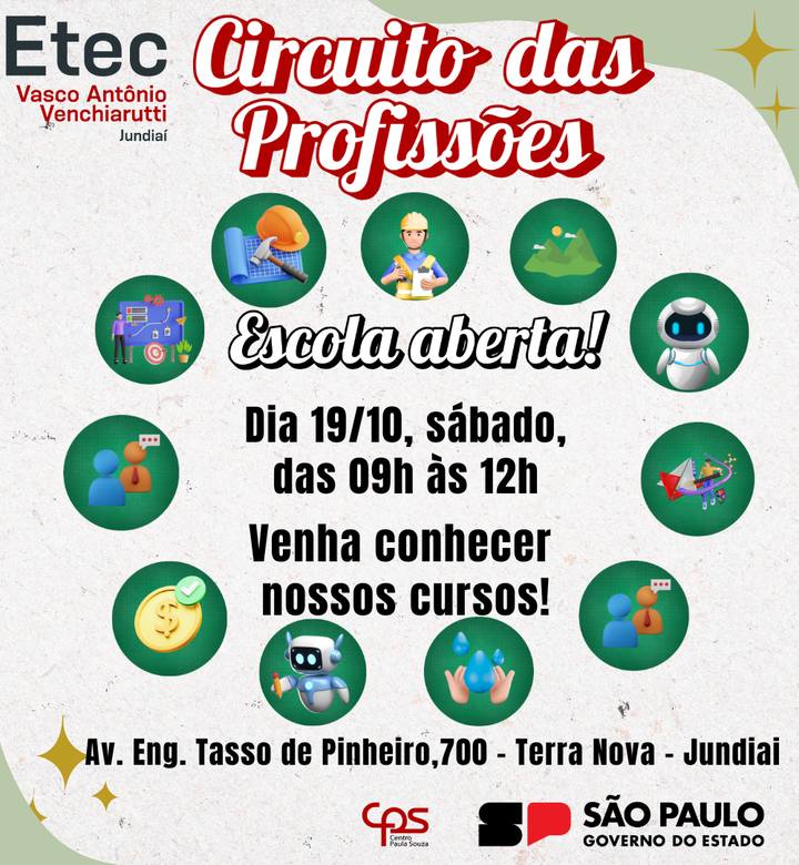 A Etec Vasco Antônio Venchiarutti, de Jundiaí (SP), realiza mais uma edição do Circuito das Profissões neste sábado (19), das 9h às 12h, para alunos do 9º ano e pessoas que queiram se qualificar para o mercado de trabalho.