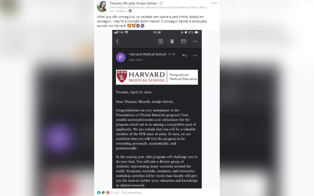 No dia 27 de abril, ela recebeu o e-mail e descobriu a aprovação na Universidade Harvard, que fica localizada em Boston e é considerada uma das maiores instituições de ensino dos Estados Unidos. A pós-graduação tem duração de seis meses e será feita nos modelos presenciais e on-line.