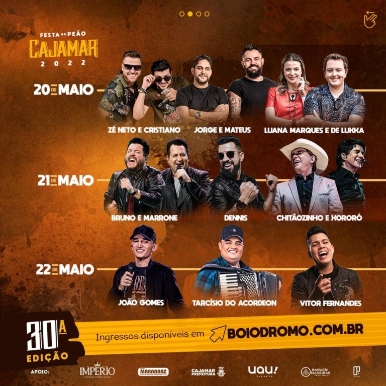 Já na abertura, no dia 20 de maio, a festa inicia a programação de shows com as duplas Zé Neto & Cristiano, Jorge & Mateus e Luana Marques & Delukka. No sábado (21), tem Bruno & Marrone, Chitãozinho & Xororó e Dennis DJ. Domingo (22), é a vez do pizeiro com João Gomes, Vitor Fernandes e Tarcísio do Arcodeon.