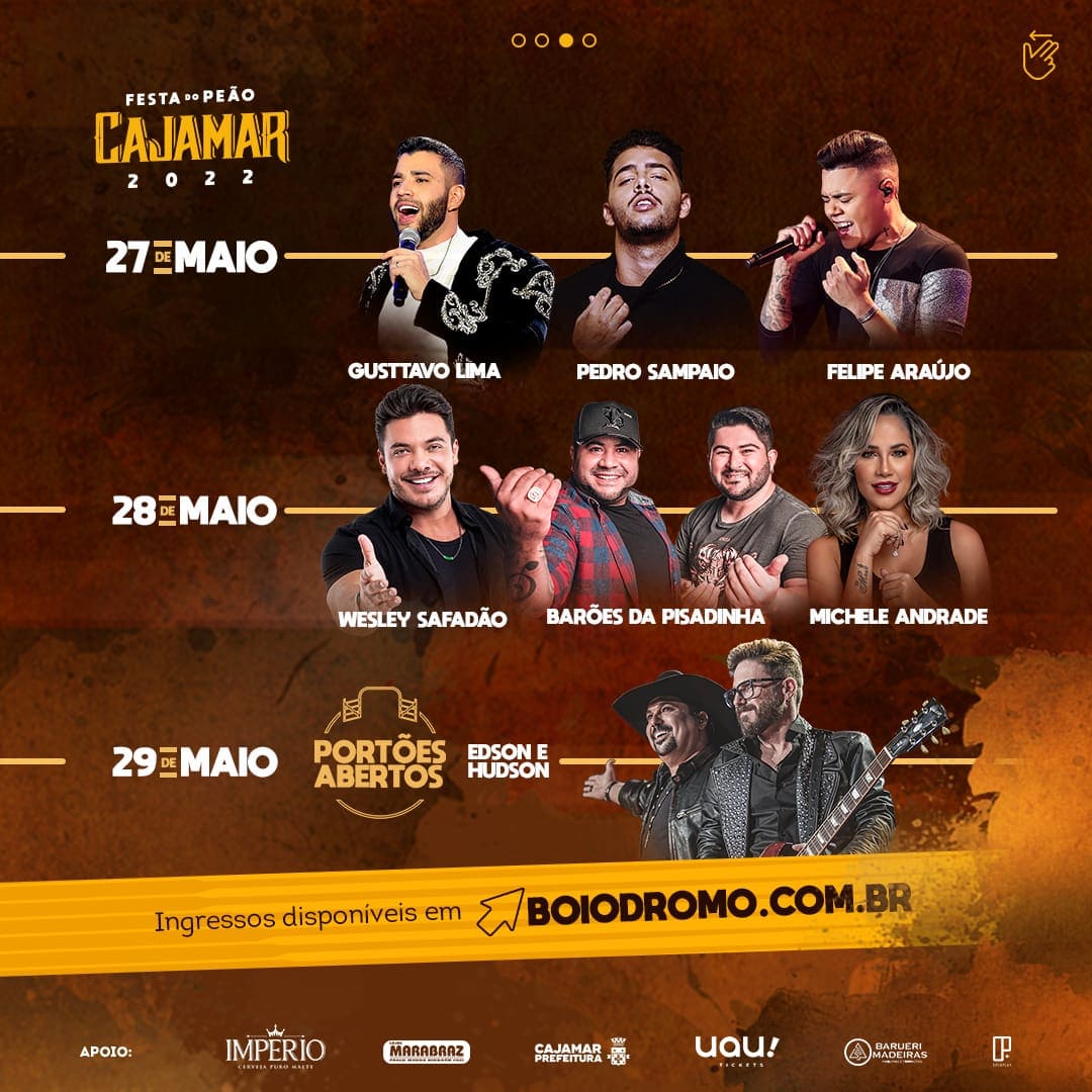 A segunda semana da 30ª Festa do Peão de Boiadeiro de Cajamar começa na sexta-feira (27), com as apresentações de Gusttavo Lima, Felipe Araújo e Pedro Sampaio. No sábado (28), muito agito com os shows de Wesley Safadão, Os Barões da Pisadinha e Michele Andrade. No último dia, domingo (29), e com os portões abertos, Edson & Hudson comandam o show de encerramento da festa.