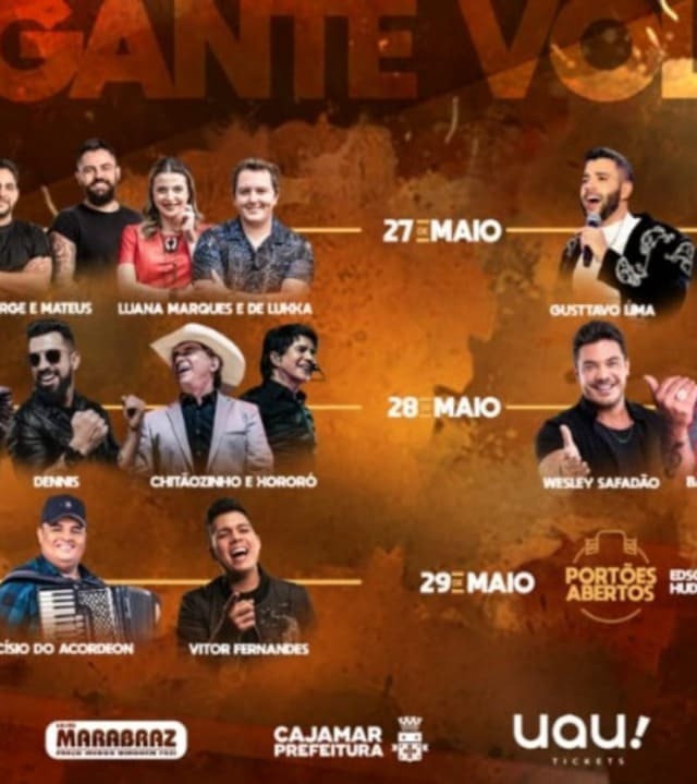 Já na abertura, no dia 20 de maio, a festa inicia a programação de shows com as duplas Zé Neto & Cristiano, Jorge & Mateus e Luana Marques & Delukka. No sábado (21), tem Bruno & Marrone, Chitãozinho & Xororó e Dennis DJ. Domingo (22), é a vez do pizeiro com João Gomes, Vitor Fernandes e Tarcísio do Arcodeon.