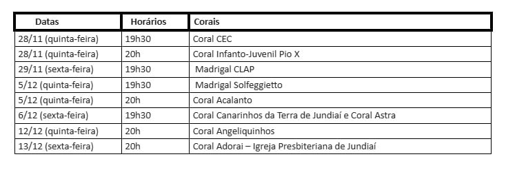 - 28/11, às 19h30 – Coral CEC: traz sentimento, beleza, espiritualidade e trabalho em grupo. Composto por 20 integrantes e regido pela maestrina Andressa Kinjo, o coral traz músicas populares e natalinas, como “Seasons of Love – Rent” e “Carol of the Bells”;