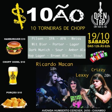 Dez torneiras de chope (copo de 300 ml), burgers (3 tipos de smash burger) e porções (batata frita, pastéis e bolinho de queijo provolone) a R$ 10: no próximo sábado (19), a Open Tap, bar de cervejas artesanais no Caxambu, em Jundiaí, promove mais uma edição do 10ÃO.