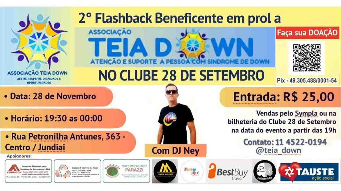 O 2° Flashback Beneficente da Teia Down chega a Jundiaí no dia 28 de novembro de 2025, reunindo música, diversão e solidariedade em prol da Associação de Pais Núcleo de Atendimento e Suporte à Pessoa com Síndrome de Down.