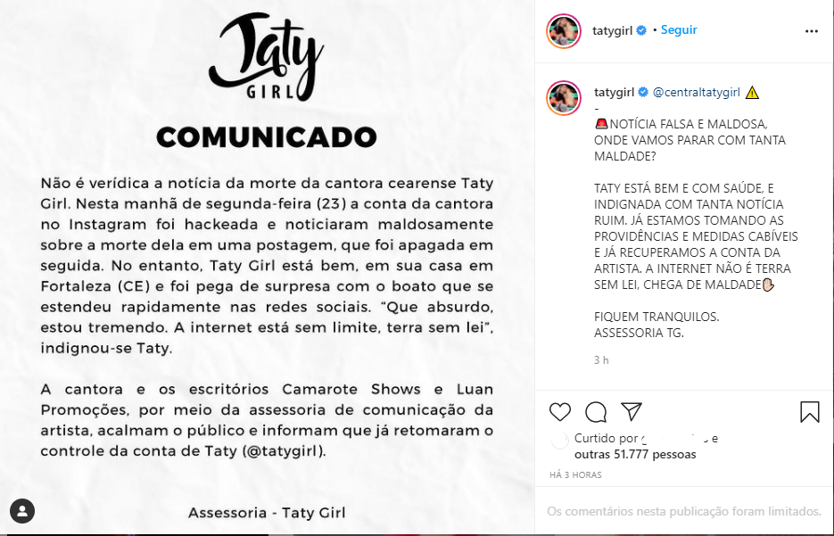 Publicado em sua conta do Instagram, a nota afirma que Taty foi hackeada, mas logo sua equipe retomou o controle de seu perfil na rede social. “Não é verídica a notícia da morte da cantora cearense Taty Girl. Nesta manhã de segunda-feira (23) a conta da cantora no Instagram foi hackeada e noticiaram maldosamente sobre a morte dela em uma postagem, que foi apagada em seguida”. A assessoria da cantora garantiu que ela está em casa muito bem e já controla o seu perfil novamente.