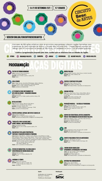 O Circuito Sesc de Artes 2021 – praças digitais apresenta de 8 a 19 de setembro uma programação totalmente on-line e gratuita com mais de mil artistas e 250 atividades de artes visuais, circo, cinema, dança, música, teatro, literatura, tecnologias, além de conteúdos sobre história e memória local, gastronomia e turismo.