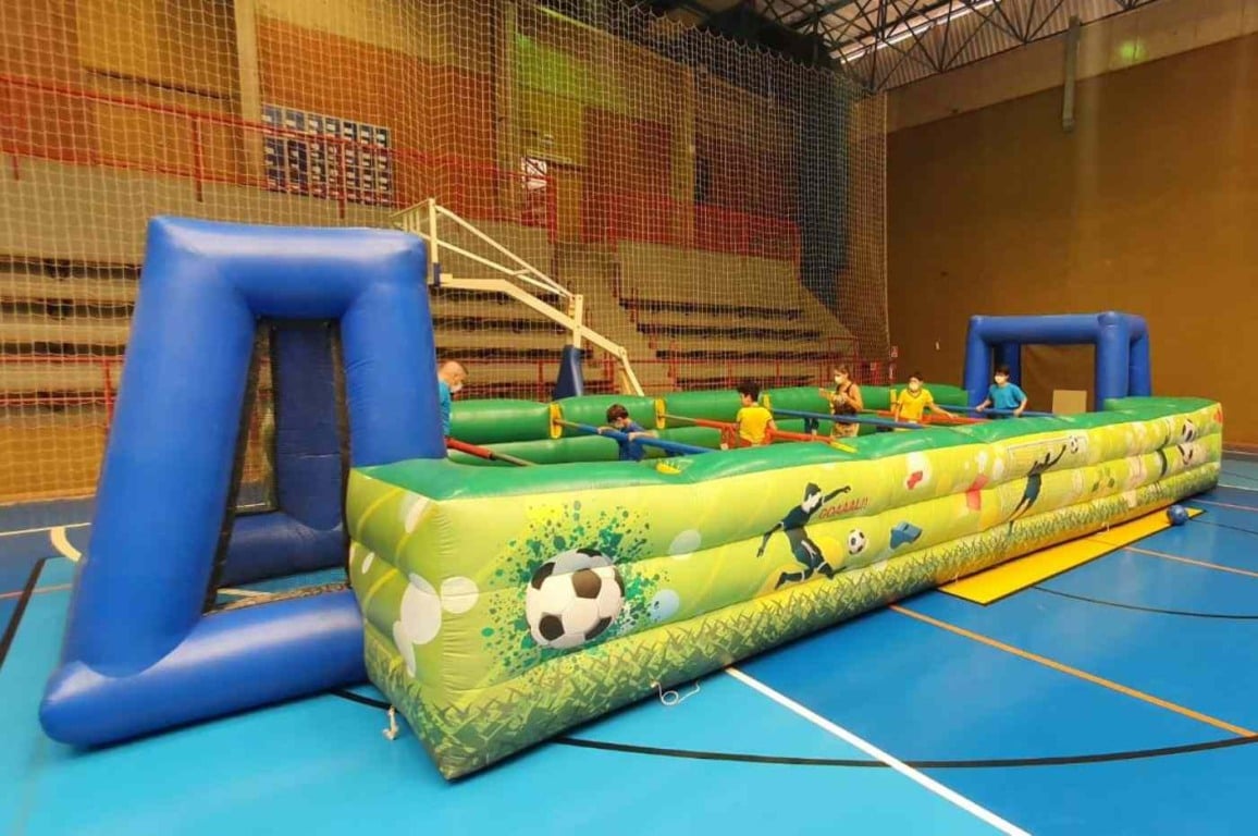 Pebolim humano inflável é a versão gigante do clássico pebolim, um animado jogo que diverte jovens e adultos e que proporciona a experiência de jogar futebol com movimentos controlados e muito trabalho em equipe.