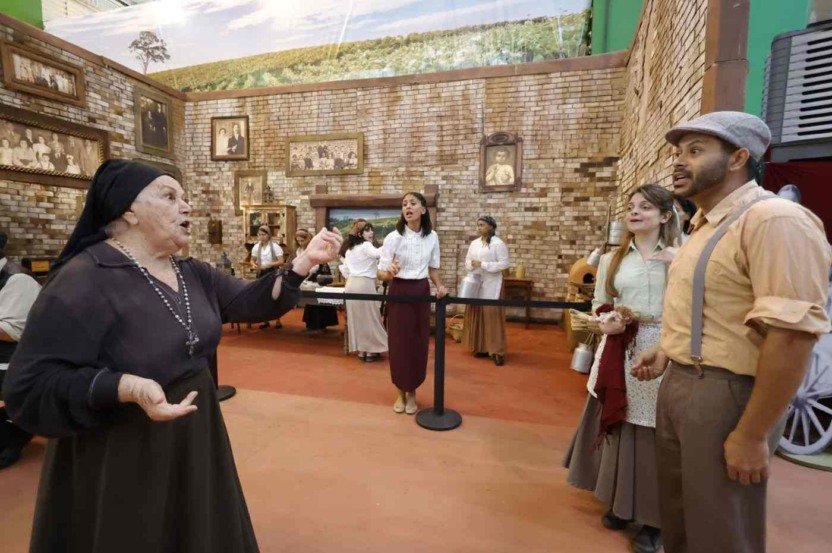 Ao som de canções italianas clássicas, como “Quel mazzolin di Fiori” e “Mérica, Mérica”, as boas-vindas aos visitantes da 38ª Festa da Uva e 9ª Expo Vinhos de Jundiaí ficam por conta do receptivo artístico com atores na Vila Italiana.