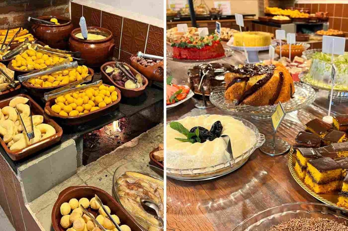 O Sítio São Francisco serve em seu bufê de café da manhã mais de 80 opções, entre bolos, pães, salgados variados, tortas, frios, cuscuz, mandioca frita, caldos, lanches montados na chapa, sucos naturais, iogurte, cereais, café, chá, frutas, doces caseiros e outras delícias.