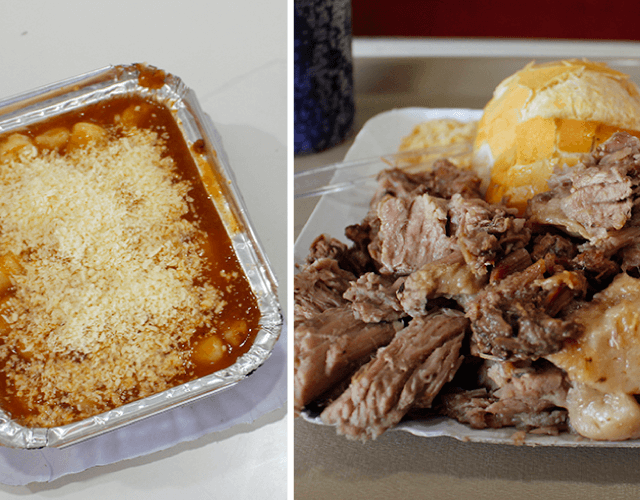 Frango frito, polenta frita, batata frita, nhoque, macarrão, água, sucos, refrigerantes e chope.