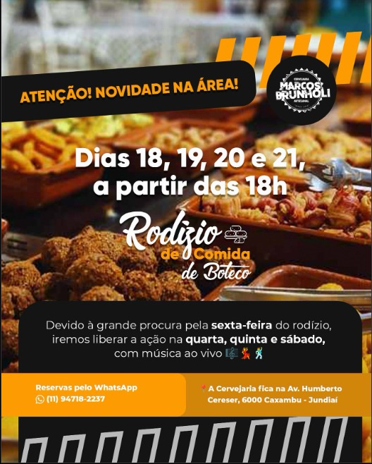 A Cervejaria Marcos Brunholi, conhecida por sua tradição e qualidade, traz uma novidade imperdível para os amantes da gastronomia de boteco. A partir desta quarta-feira (18) até sábado (21), das 18h às 23h, o espaço oferecerá um rodízio especial de Comida de Boteco, com mais de 30 opções de porções e petiscos à vontade, por apenas R$ 70 por pessoa.