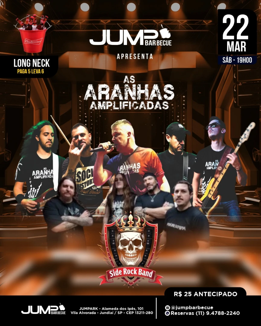 O sábado será embalado pelo melhor do rock com as bandas Aranhas Amplificadas e Side Rock, prometendo shows inesquecíveis para os fãs do gênero. A festa começa às 19h e também contará com a promoção especial de Longneck: Pague 5, leve 6.
