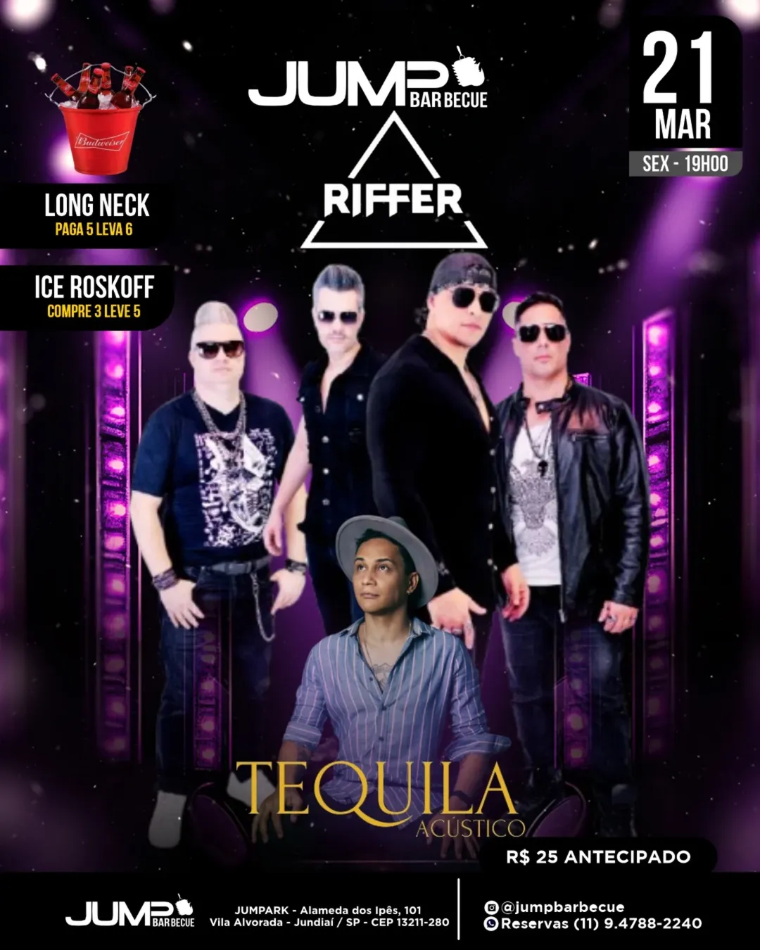 A sexta promete muito rock com as bandas Riffer e Tequila Acústico, trazendo um repertório repleto de clássicos e energia contagiante. O evento começa às 19h e conta com as promoções especiais: Longneck, Pague 5, leve 6 e Ice Roskoff, Pague 3, leve 6.