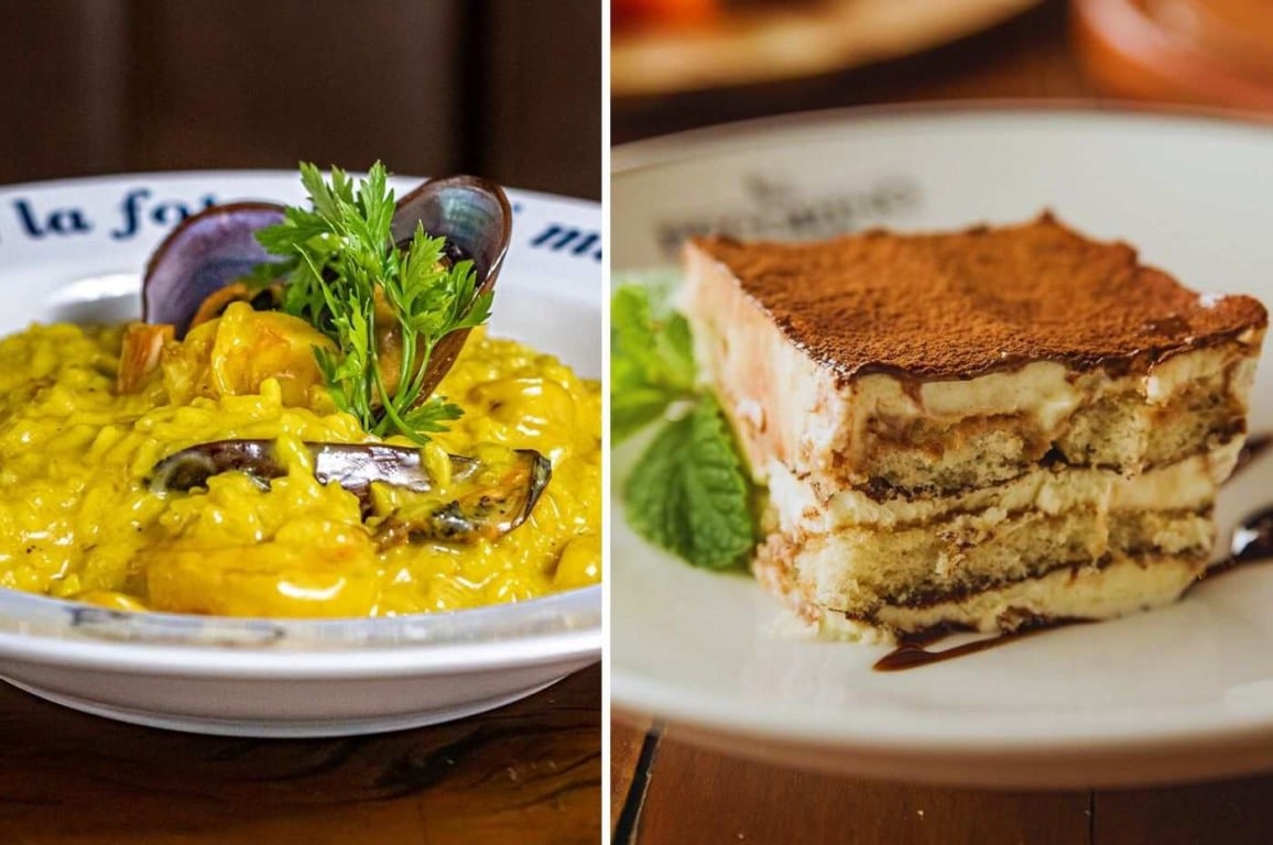 Se a pedida for risoto, prove a versão com lulas, camarões e mexilhões (à esquerda). Prefere carnes? Paleta de cordeiro ao forno com risoto de cogumelos secos, e bife de chorizo grelhado com espaguete ao alho e óleo são ótimas sugestões. No cardápio ainda figuram opções de saladas, peixes, omeletes, e claro, sobremesas, entre elas, tiramisu (à direta).