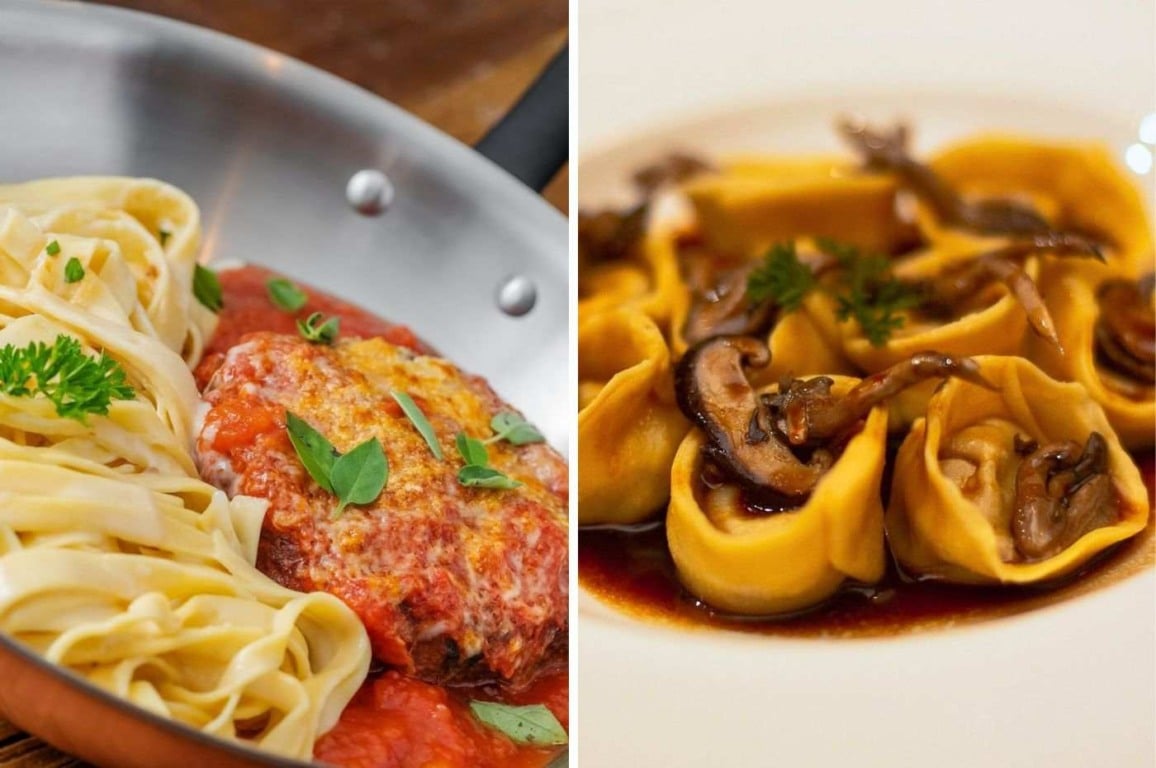 Além das massas, no menu estão presentes receitas variadas de carnes, peixes e risotos, tais como polpettone recheado de muçarela ao molho de tomate, acompanhado de fettuccine com grana padano (à esquerda); polvo puxado no azeite com ervas, batata e cogumelos; risoto de açafrão com ossobuco; e galeto grelhado com batata salteada ao molho rôti.
