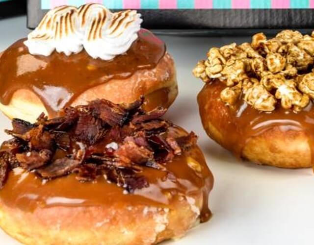 O donut de bacon é feito com pedaços de toucinho no xarope de maple quanto à pipoca doce acompanha de caramelo por cima do doce, ambas, versões não têm recheio, e por isso, custam R$ 7.