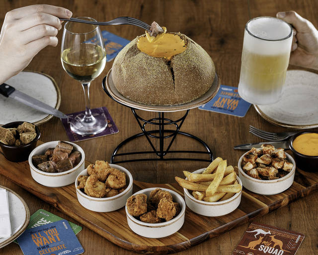 Tanto a opção salgada (R$ 75), à base de queijo e molho ranch, quanto a doce (R$ 60), com calda de chocolate belga Callebaut, são servidas dentro do famoso pão australiano da casa, que ganha formato arredondado.