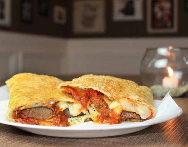 O de lasanha é preenchido com molho bolonhesa, tomate, queijo e presunto. Já o de parmegiana leva filé-mignon, molho de tomate, queijo e orégano.
