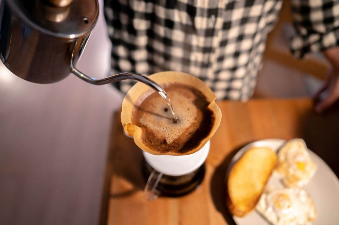 - Despeje a água quente sobre o café moído no coador, em movimentos circulares, garantindo uma extração uniforme.