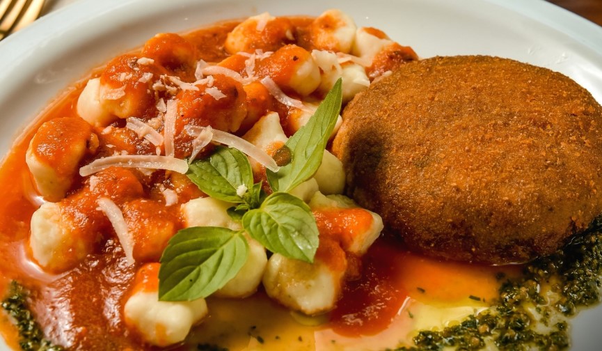 E o Polpetone, outro clássico do cardápio Família Brunholi Restaurante: recheado com mozarela e acompanhado do delicioso gnocchi ao sugo – uma combinação perfeita para quem é apaixonado pela culinária italiana.