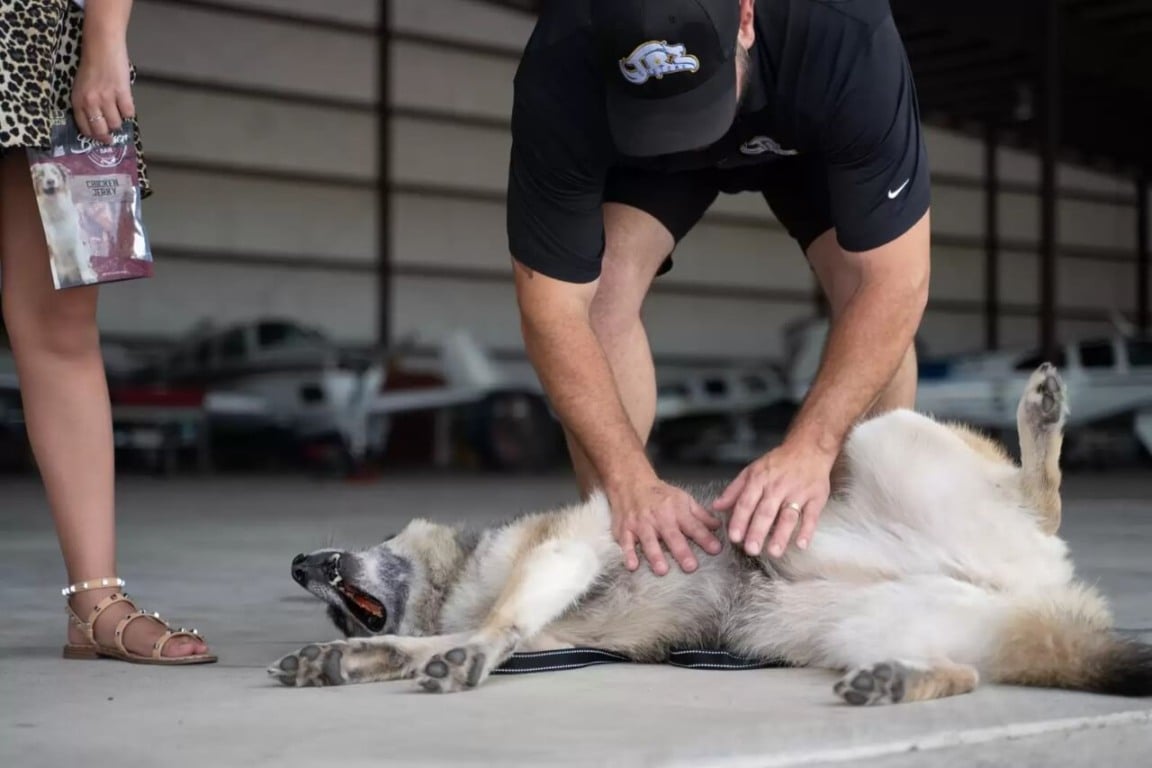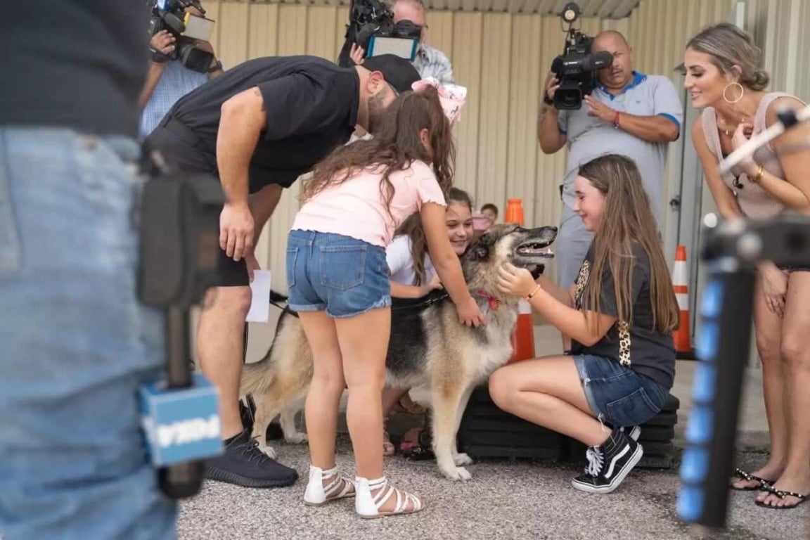 Quando a Sheba saiu do avião, Moore-Malmstrom ficou impressionada por finalmente ver o seu cão depois de tanto tempo. Sheba ficou emocionada ao ver as filhas de Moore-Malmstrom e correu imediatamente para lá.